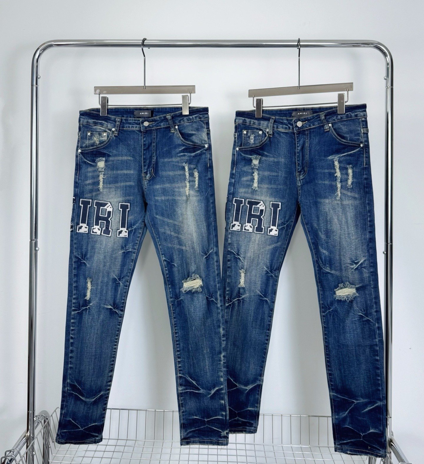 AMIRI Varsity Logo Distressed Jeans Blauw
