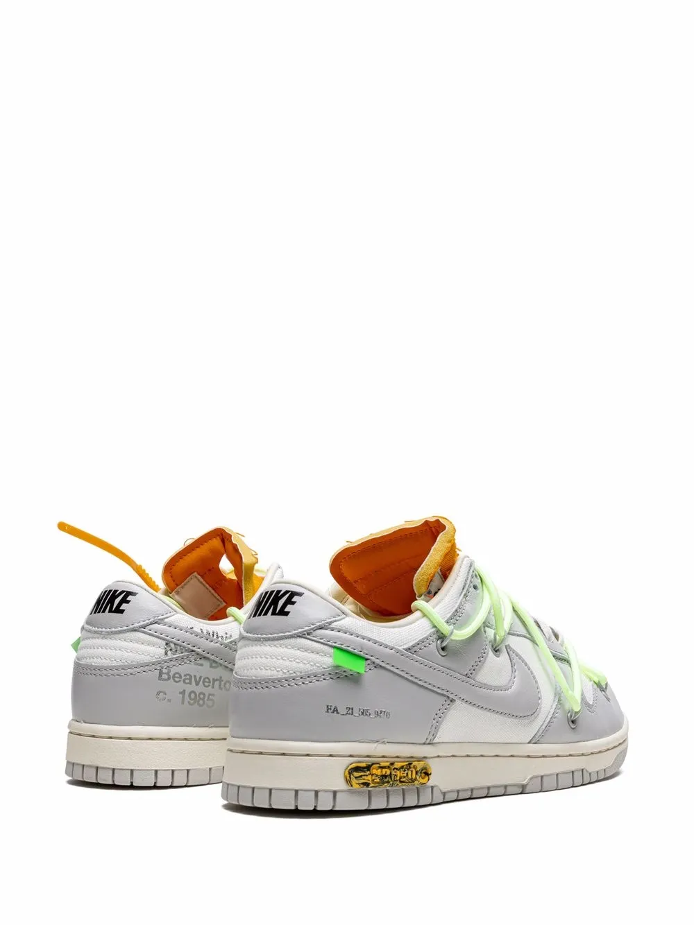 De Nike Dunk X Off-White Lot 42 sono parte di een collaborazione esclusiva tussen Nike en het designer Virgil Abloh, uitgebracht in 2021 come parte van de collezione “The 50”. Queste sneaker hebben een bovenwerk van leer en canvas grigia, accentuata door details groen fluo, come de lacci supplementari en de tag zip-tie, distintivi van marchio Off-White. Het design è completato door un’etichetta laterale met de numero “42 of 50”, die indica l’edizione limitata. De rubberen zool biedt grip en resistenza, terwijl de tussenzool in schiuma garandeert comfort. Queste sneaker sono een mix perfetto di arte en mode, celebrando l’innovazione creativa en l’influenza di Abloh in mondo dello streetwear.